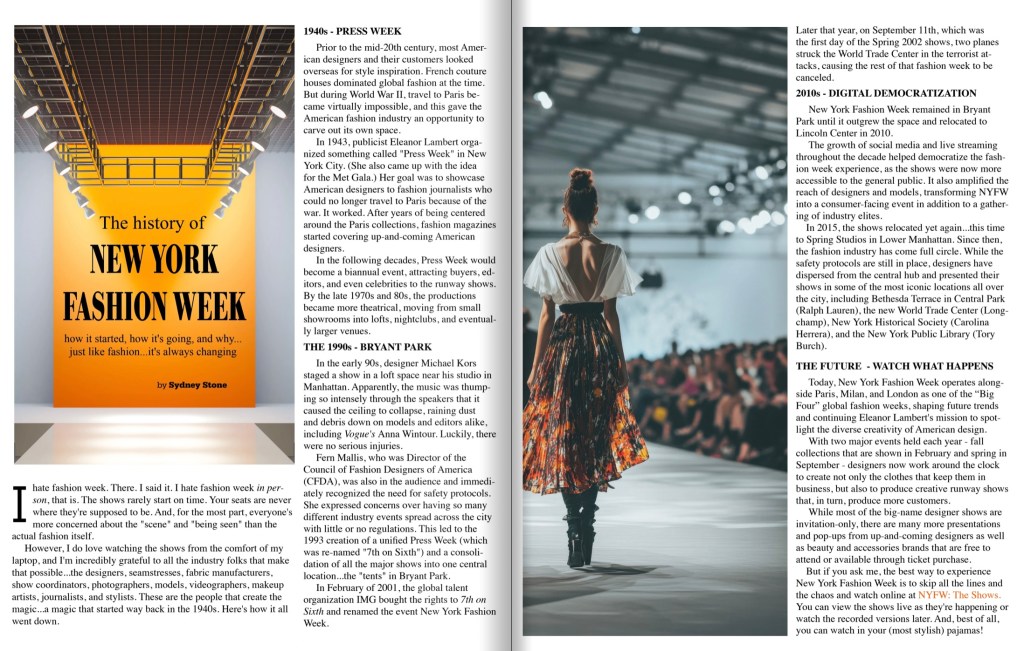 In 1943, publicist Eleanor Lambert organized something called “Press Week” in New York City. (She also came up with the idea for the Met Gala.) Her goal was to showcase American designers to fashion journalists who could no longer travel to Paris because of the war. It worked. After years of being centered around the Paris collections, fashion magazines started covering up-and-coming American designers.